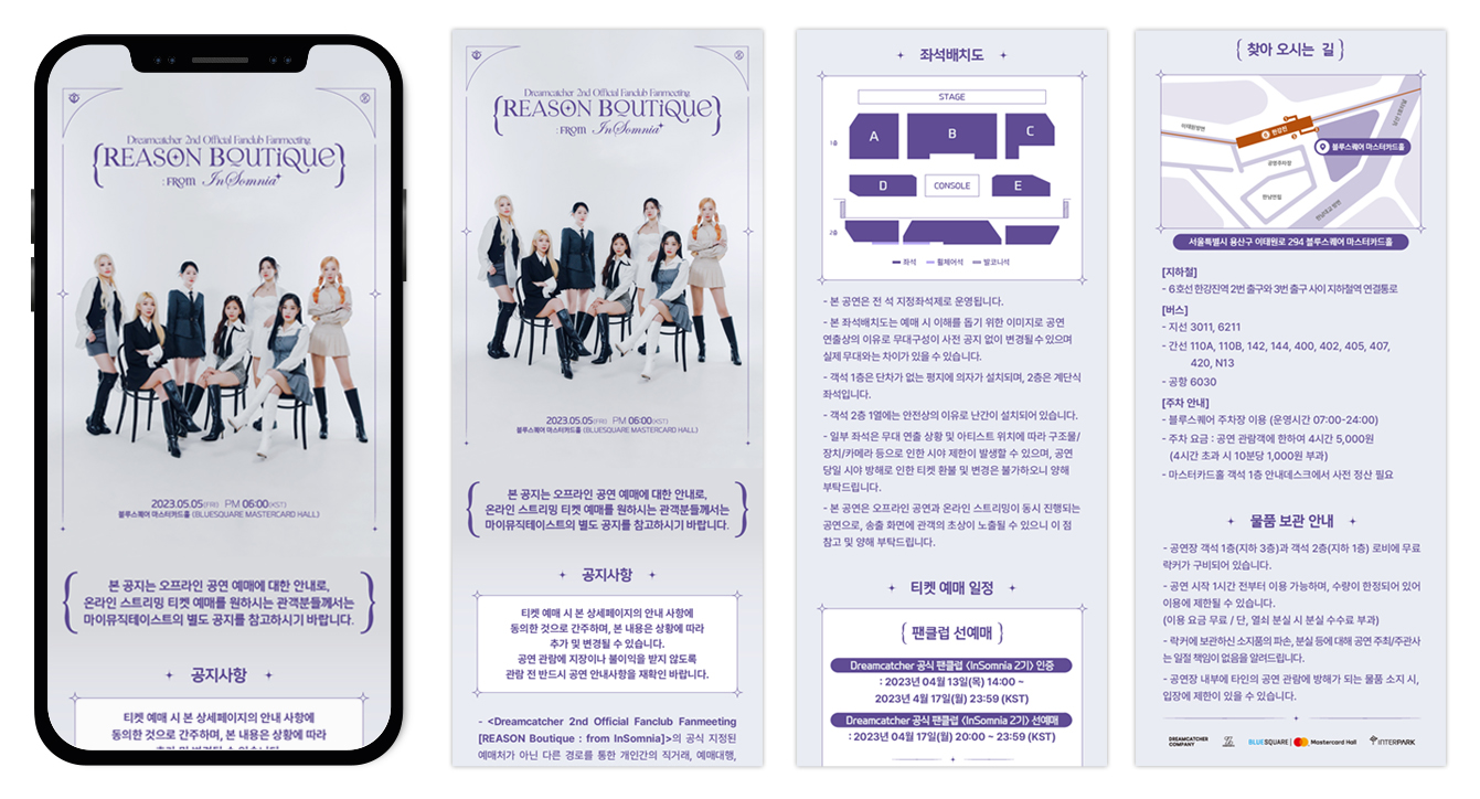 드림캐쳐 2번째 공식 팬클럽 팬미팅 [리즌 부띠끄 : 프롬 인썸니아]의 포스터와 예매 페이지를 디자인하였습니다..